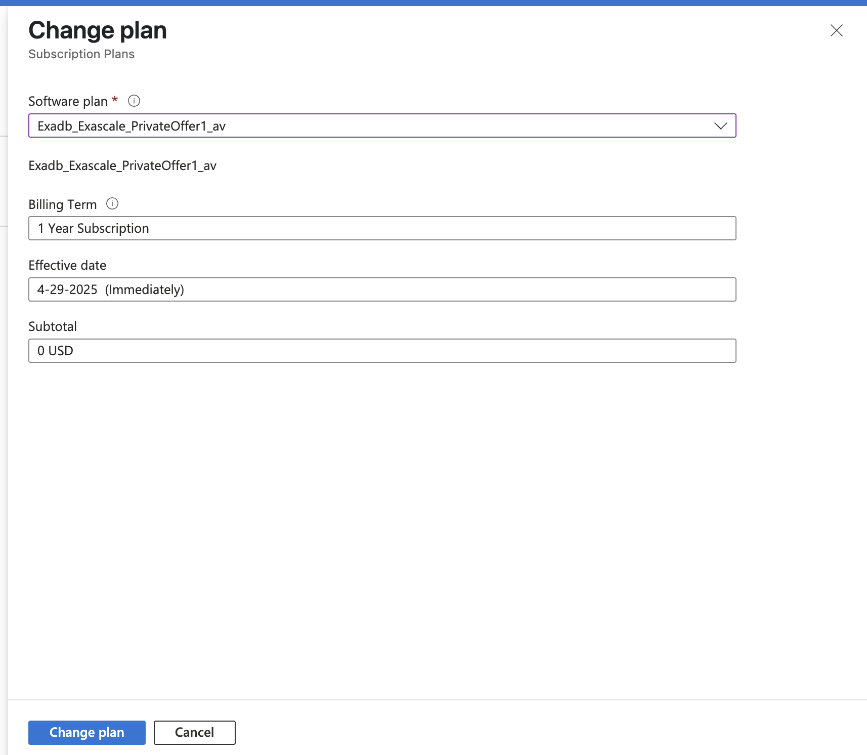 If you need to change your Oracle Database@Azure purchase plan, start by contacting Oracle Sales and requesting a new private offer. After you receive and accept the new private offer, follow the steps in this topic to update your plan details in Azure. Common scenarios for changing a purchase plan include expiration of an existing private offer or transitioning from a public offer to a private offer.